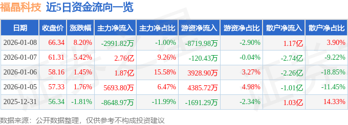 证券之星消息,截至2026年1月8日收盘,福晶科技(002222)报收于66.34元,上涨8.2%,换手率9.67%,成交量45.29万手,成交额30.05亿元。