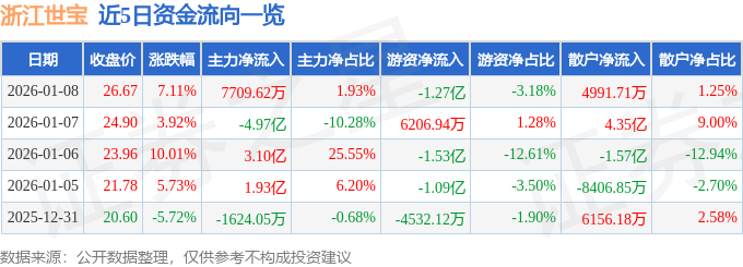 证券之星消息,截至2026年1月8日收盘,浙江世宝(002703)报收于26.67元,上涨7.11%,换手率26.42%,成交量154.85万手,成交额39.89亿元。