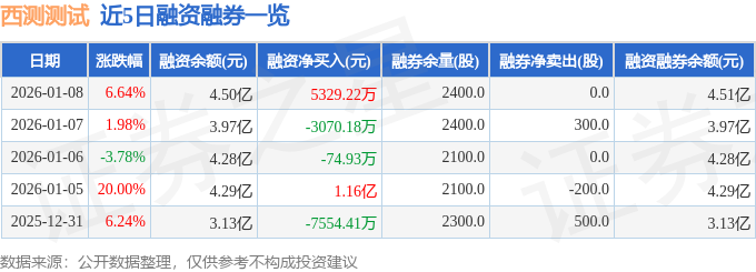 西测测试融资融券信息显示,融资方面,当日融资买入2.17亿元,融资偿还1.64亿元,融资净买入5329.22万元。融券方面,融券卖出0.0股,融券偿还0.0股,融券余量2400.0股,融券余额34.46万元。融资融券余额4.51亿元。