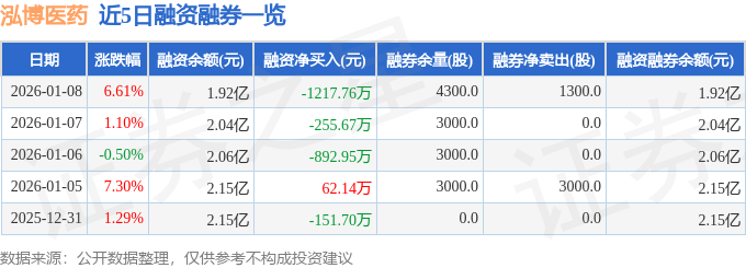 证券之星消息,截至2026年1月8日收盘,泓博医药(301230)报收于34.37元,上涨6.61%,换手率10.64%,成交量13.36万手,成交额4.6亿元。