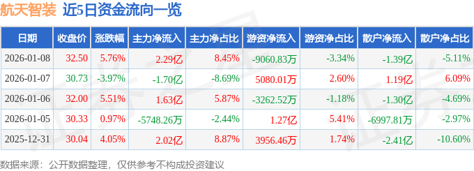 证券之星消息,截至2026年1月8日收盘,航天智装(300455)报收于32.5元,上涨5.76%,换手率12.22%,成交量86.58万手,成交额27.11亿元。