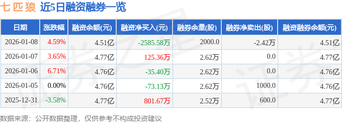 七 匹 狼融资融券信息显示,融资方面,当日融资买入8480.49万元,融资偿还1.11亿元,融资净偿还2585.58万元。融券方面,融券卖出0.0股,融券偿还2.42万股,融券余量2000.0股,融券余额2.55万元。融资融券余额4.51亿元。