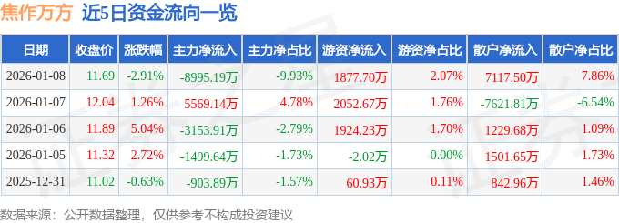 1月8日的资金流向数据方面,主力资金净流出8995.19万元,占总成交额9.93%,游资资金净流入1877.7万元,占总成交额2.07%,散户资金净流入7117.5万元,占总成交额7.86%。