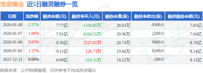 宝武镁业融资融券信息显示,融资方面,当日融资买入7133.05万元,融资偿还8463.89万元,融资净偿还1330.85万元。融券方面,融券卖出2900.0股,融券偿还1.22万股,融券余量20.03万股,融券余额334.3万元。融资融券余额7.81亿元。
