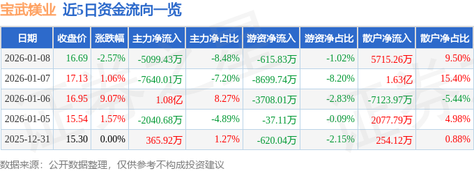 证券之星消息,截至2026年1月8日收盘,宝武镁业(002182)报收于16.69元,下跌2.57%,换手率4.12%,成交量35.62万手,成交额6.01亿元。