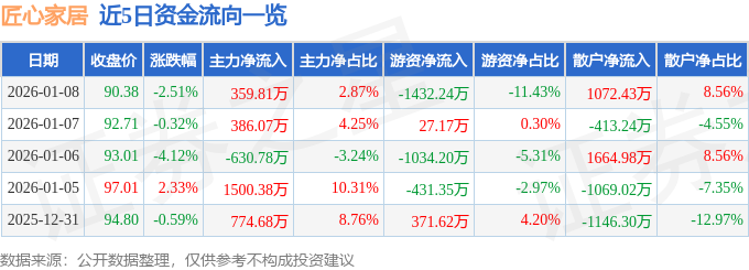 证券之星消息,截至2026年1月8日收盘,匠心家居(301061)报收于90.38元,下跌2.51%,换手率0.95%,成交量1.38万手,成交额1.25亿元。