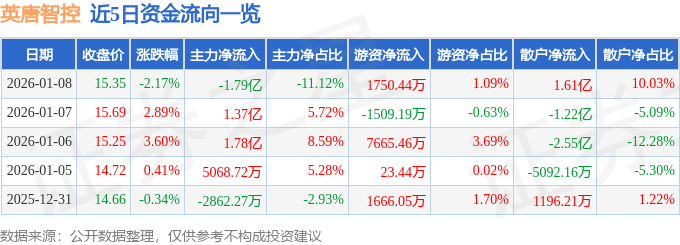 证券之星消息,截至2026年1月8日收盘,英唐智控(300131)报收于15.35元,下跌2.17%,换手率10.03%,成交量104.58万手,成交额16.08亿元。