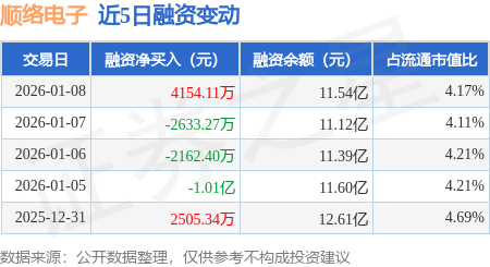 证券之星消息,1月8日,顺络电子(002138)融资买入1.34亿元,融资偿还9293.87万元,融资净买入4154.11万元,融资余额11.54亿元。