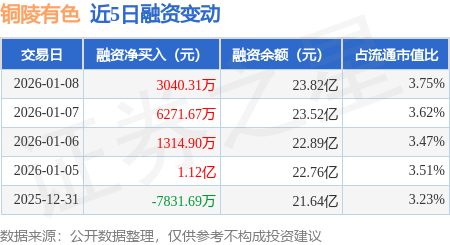 证券之星消息,1月8日,铜陵有色(000630)融资买入3.44亿元,融资偿还3.14亿元,融资净买入3040.31万元,融资余额23.82亿元,近3个交易日已连续净买入累计1.06亿元,近20个交易日中有13个交易日出现融资净买入。
