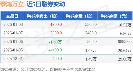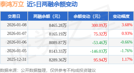 证券之星消息,1月8日,泰鸿万立(603210)融资买入558.86万元,融资偿还262.49万元,融资净买入296.37万元,融资余额8454.76万元。