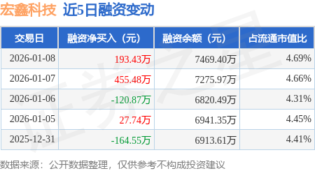 证券之星消息,1月8日,宏鑫科技(301539)融资买入1005.51万元,融资偿还812.08万元,融资净买入193.43万元,融资余额7469.4万元。