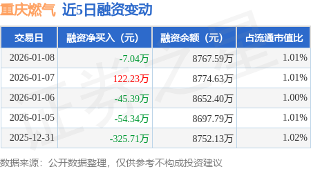 证券之星消息,1月8日,重庆燃气(600917)融资买入262.81万元,融资偿还269.85万元,融资净卖出7.04万元,融资余额8767.59万元。