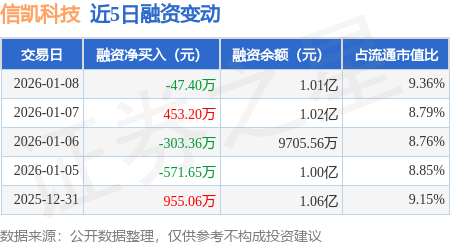 证券之星消息,1月8日,信凯科技(001335)融资买入2318.88万元,融资偿还2366.28万元,融资净卖出47.4万元,融资余额1.01亿元。