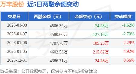 证券之星消息,1月8日,万丰股份(603172)融资买入203.78万元,融资偿还278.06万元,融资净卖出74.28万元,融资余额4506.14万元。