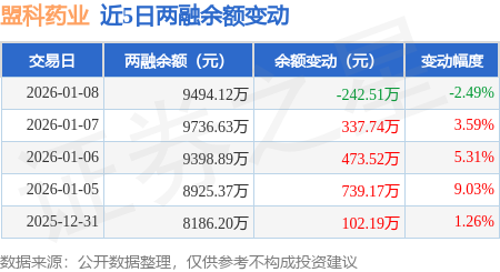 证券之星消息,1月8日,盟科药业(688373)融资买入815.44万元,融资偿还1057.94万元,融资净卖出242.51万元,融资余额9494.12万元,近20个交易日中有12个交易日出现融资净买入。