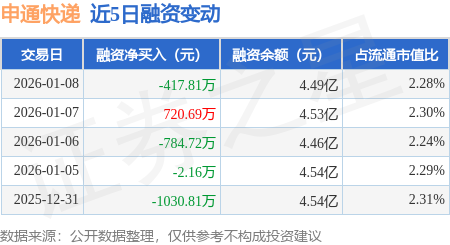 证券之星消息,1月8日,申通快递(002468)融资买入1882.24万元,融资偿还2300.05万元,融资净卖出417.81万元,融资余额4.49亿元。
