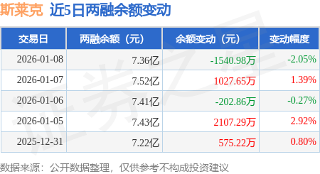证券之星消息,1月8日,斯莱克(300382)融资买入3397.19万元,融资偿还4938.14万元,融资净卖出1540.95万元,融资余额7.36亿元,近20个交易日中有12个交易日出现融资净买入。