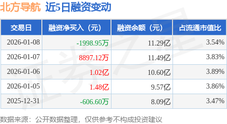 证券之星消息,1月8日,北方导航(600435)融资买入5.99亿元,融资偿还6.19亿元,融资净卖出1998.95万元,融资余额11.29亿元,近20个交易日中有12个交易日出现融资净买入。
