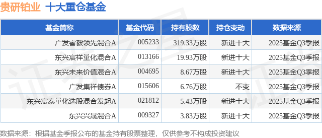 根据2025基金Q3季报公募基金重仓股数据,重仓该股的公募基金共6家,其中持有数量最多的公募基金为广发基金的广发睿毅领先混合A。广发睿毅领先混合A目前规模为12.27亿元,最新净值2.7116(1月8日),较上一交易日下跌0.99%,近一年上涨15.31%。该公募基金现任基金经理为林英睿。林英睿在任的基金产品包括:广发多策略混合,管理时间为2016年12月16日至今,期间收益率为99.45%;广发聚富混合,管理时间为2018年11月5日至今,期间收益率为91.75%;广发价值领先混合A,管理时间为2020年5月7日至今,期间收益率为82.49%。