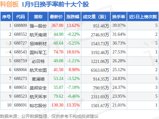 当日科创板换手率前10大个股中4只个股收涨,平均涨幅13.47%,其中强一股份(688809)以换手率39.07%排第一,8只个股近5个交易日中多次上榜。