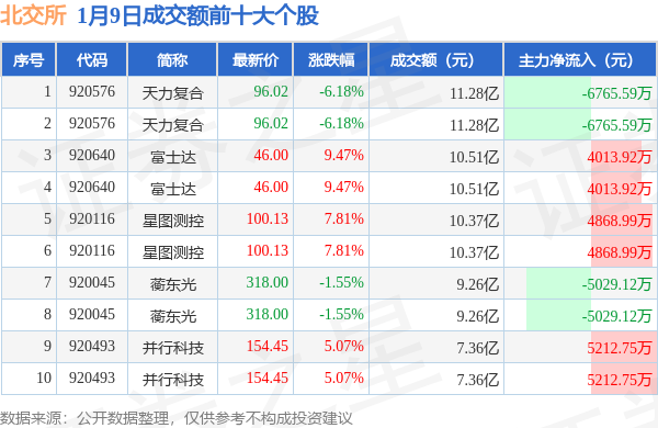 当日北交所成交额前10大个股中6只个股收涨,平均涨幅7.45%,其中天力复合(920576)以成交额11.28亿元排第一。从主力资金流入看,成交额前10大个股中有6只个股呈现主力资金净流入。