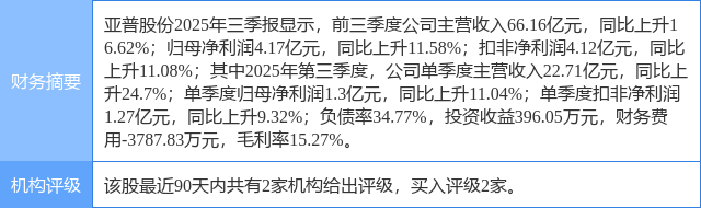 2025年11月4日,中邮证券研究员付秉正发布了对亚普股份的研报《25Q3业绩符合预期,燃油系统主业竞争力增强》,该研报对亚普股份给出“买入”评级。研报中预计2025-2027年营收为89.25/98.90/109.02亿元,归母净利润为5.57/6.21/7.12亿元,当前股价对应PE为21.8/19.5/17.1倍维持“买入”评级。证券之星数据中心根据近三年发布的研报数据计算,该研报作者对此股的盈利预测准确度为73.3%。