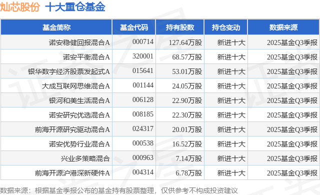 根据2025基金Q3季报公募基金重仓股数据,重仓该股的公募基金共20家,其中持有数量最多的公募基金为诺安基金的诺安稳健回报混合A。诺安稳健回报混合A目前规模为3.59亿元,最新净值2.146(1月8日),较上一交易日上涨1.27%,近一年上涨101.5%。该公募基金现任基金经理为邓心怡。邓心怡在任的基金产品包括:诺安平衡混合A,管理时间为2022年10月15日至今,期间收益率为45.59%;诺安优势行业混合A,管理时间为2025年3月6日至今,期间收益率为24.78%;诺安研究优选混合A,管理时间为2025年3月6日至今,期间收益率为74.6%。