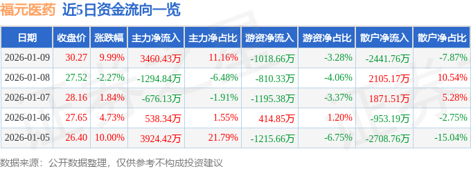 证券之星消息,截至2026年1月9日收盘,福元医药(601089)报收于30.27元,上涨9.99%,涨停,换手率2.26%,成交量10.86万手,成交额3.1亿元。