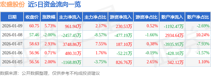 证券之星消息,截至2026年1月9日收盘,宏盛股份(603090)报收于60.75元,上涨5.73%,换手率7.35%,成交量7.35万手,成交额4.44亿元。