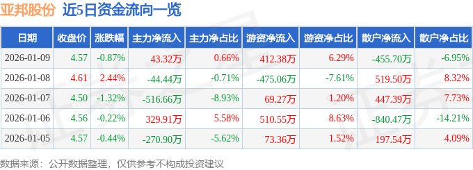 证券之星消息,截至2026年1月9日收盘,亚邦股份(603188)报收于4.57元,下跌0.87%,换手率2.52%,成交量14.38万手,成交额6553.89万元。