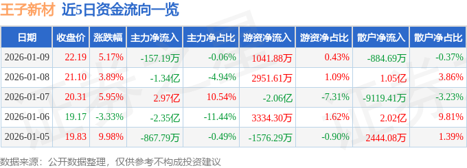 证券之星消息,截至2026年1月9日收盘,王子新材(002735)报收于22.19元,上涨5.17%,换手率40.2%,成交量112.76万手,成交额24.21亿元。