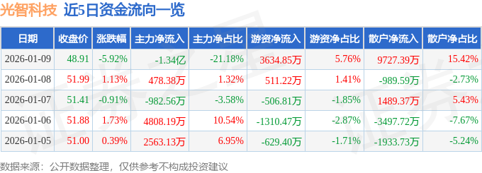 证券之星消息,截至2026年1月9日收盘,光智科技(300489)报收于48.91元,下跌5.92%,换手率9.25%,成交量12.69万手,成交额6.31亿元。