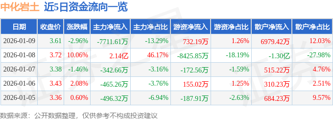 证券之星消息,截至2026年1月9日收盘,中化岩土(002542)报收于3.61元,下跌2.96%,换手率9.03%,成交量158.87万手,成交额5.8亿元。