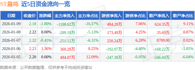 1月9日的资金流向数据方面,主力资金净流出1108.62万元,占总成交额16.17%,游资资金净流入484.28万元,占总成交额7.06%,散户资金净流入624.35万元,占总成交额9.11%。