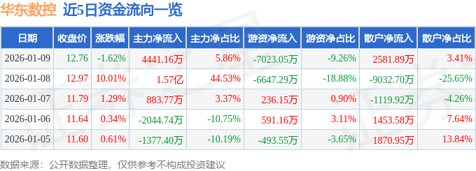 证券之星消息,截至2026年1月9日收盘,华东数控(002248)报收于12.76元,下跌1.62%,换手率19.37%,成交量59.55万手,成交额7.58亿元。