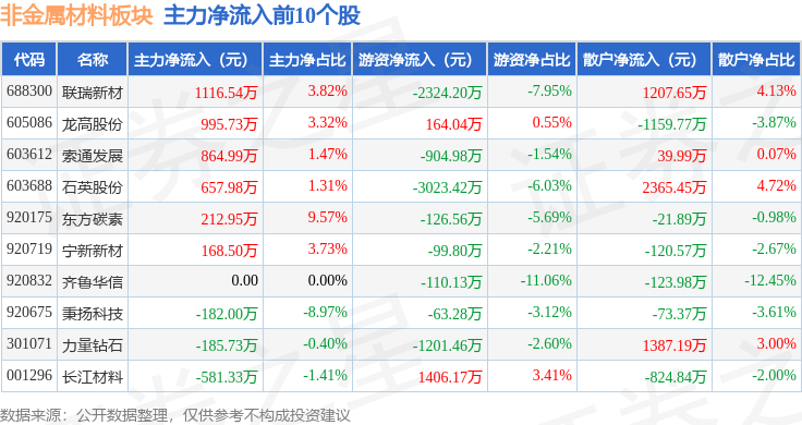 从资金流向上来看,当日非金属材料板块主力资金净流入1907.04万元,游资资金净流出5980.79万元,散户资金净流入4073.75万元。非金属材料板块个股资金流向见下表: