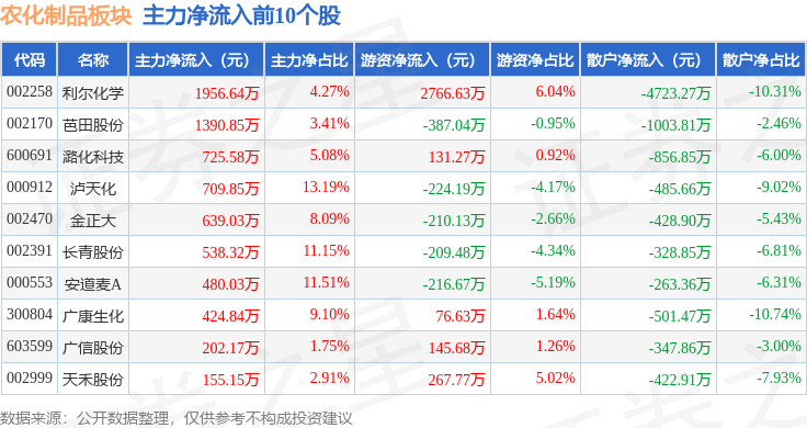 从资金流向上来看,当日农化制品板块主力资金净流出8.96亿元,游资资金净流出1.23亿元,散户资金净流入10.19亿元。农化制品板块个股资金流向见下表: