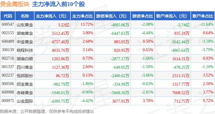 从资金流向上来看,当日贵金属板块主力资金净流入3.71亿元,游资资金净流出1.62亿元,散户资金净流出2.08亿元。贵金属板块个股资金流向见下表: