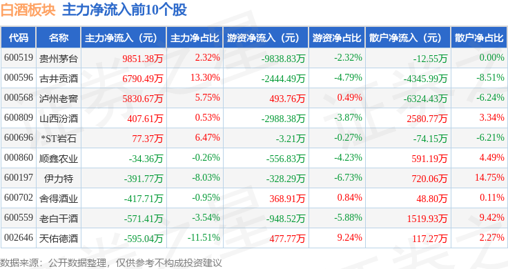 从资金流向上来看,当日白酒板块主力资金净流出8893.72万元,游资资金净流出99.25万元,散户资金净流入8992.98万元。白酒板块个股资金流向见下表: