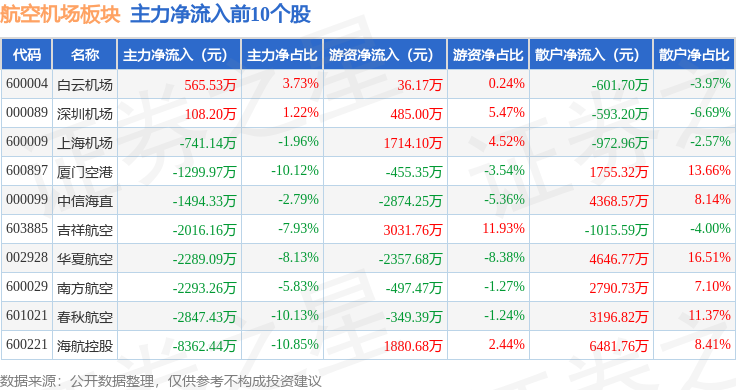 从资金流向上来看,当日航空机场板块主力资金净流出4.08亿元,游资资金净流入3085.28万元,散户资金净流入3.77亿元。航空机场板块个股资金流向见下表: