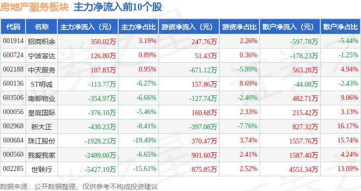 从资金流向上来看,当日房地产服务板块主力资金净流出1.8亿元,游资资金净流入3005.31万元,散户资金净流入1.5亿元。房地产服务板块个股资金流向见下表: