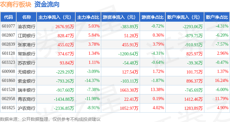 从资金流向上来看,当日农商行板块主力资金净流出1282.95万元,游资资金净流入1631.29万元,散户资金净流出348.35万元。农商行板块个股资金流向见下表: