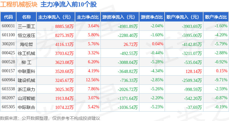 从资金流向上来看,当日工程机械板块主力资金净流入1.27亿元,游资资金净流出1.83亿元,散户资金净流入5644.52万元。工程机械板块个股资金流向见下表: