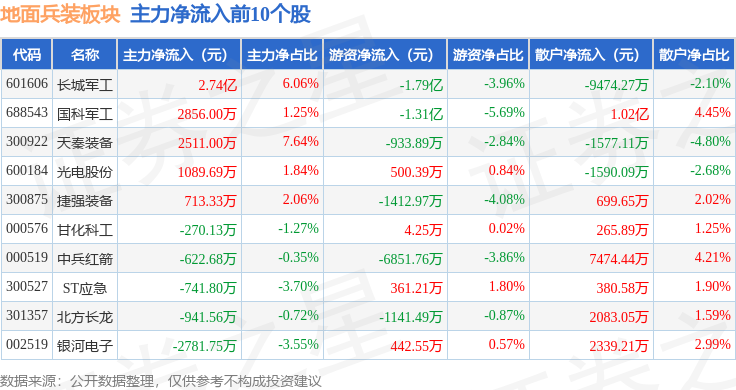 从资金流向上来看,当日地面兵装板块主力资金净流出1.72亿元,游资资金净流出5.22亿元,散户资金净流入6.94亿元。地面兵装板块个股资金流向见下表: