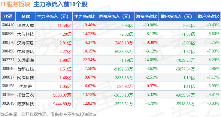 从资金流向上来看,当日IT服务板块主力资金净流出6.98亿元,游资资金净流出12.75亿元,散户资金净流入19.73亿元。IT服务板块个股资金流向见下表: