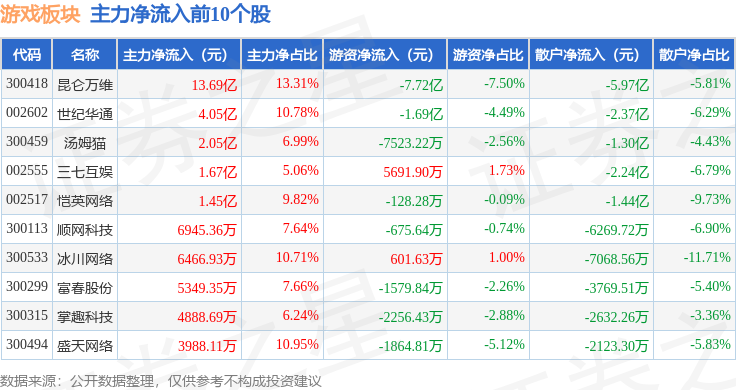 从资金流向上来看,当日游戏板块主力资金净流入26.93亿元,游资资金净流出10.54亿元,散户资金净流出16.39亿元。游戏板块个股资金流向见下表: