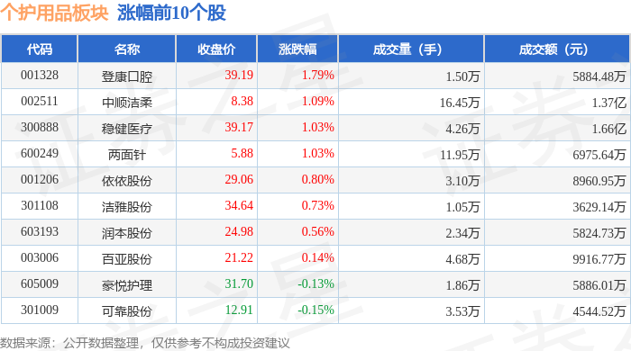 证券之星消息,1月9日个护用品板块较上一交易日上涨0.64%,登康口腔领涨。当日上证指数报收于4120.43,上涨0.92%。深证成指报收于14120.15,上涨1.15%。个护用品板块个股涨跌见下表: