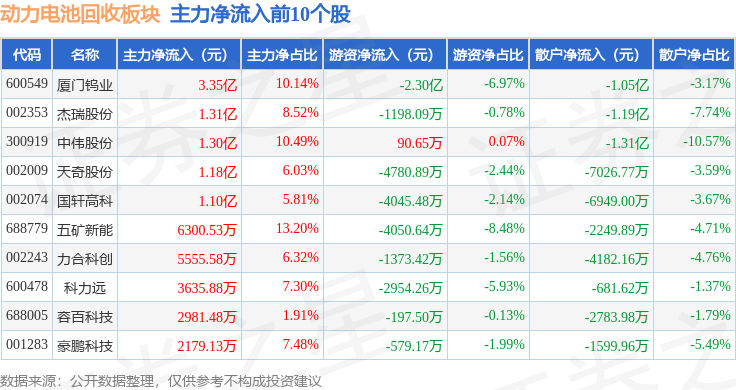 从资金流向上来看,当日动力电池回收板块主力资金净流出7.27亿元,游资资金净流出3.46亿元,散户资金净流入10.73亿元。动力电池回收板块个股资金流向见下表:
