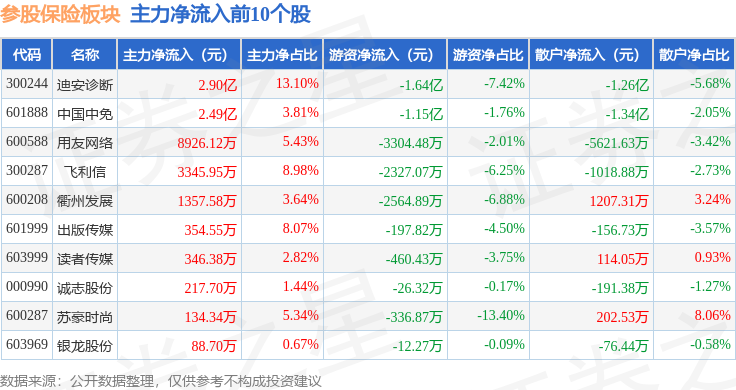 从资金流向上来看,当日参股保险板块主力资金净流出33.89亿元,游资资金净流入3.62亿元,散户资金净流入30.27亿元。参股保险板块个股资金流向见下表: