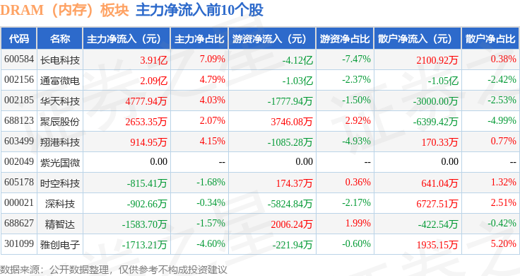 从资金流向上来看,当日DRAM(内存)板块主力资金净流出24.1亿元,游资资金净流入2.44亿元,散户资金净流入21.66亿元。DRAM(内存)板块个股资金流向见下表: